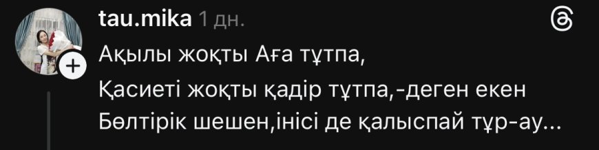 «Тұрсынбек ағаның жанында жүргендердің бәрі «мақалшы» боп кете ме? Әйелі де тек мақалдатып жазғыш әйтеуір», «Осы ағаң ақыл айтпай-ақ қойсыншы», «Бұның өзіне ақыл керек қой», «Тұрсынбектен қандай ақыл, сенен қандай ілтипат?», «Қотыр атқа соқыр ат, бір-бірлерін жақсы тауыпты»,– деп жазды желі қолданушылары.