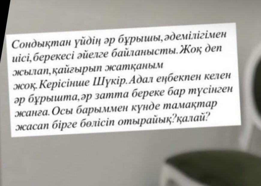 "Ыдысты да қолмен жуамын десем сенесіз бе? Бірақ солай. Есесіне рухани баймын. Негізі неше түрліні пісіретін өнерім бар, бірақ ас үйдегі жиһазым келсін. Сосын патырлатып көрсетіп, салып отырамын. Әзірге лажы осы. Суды да тасып ішеміз. Дайынға келдің, аспаннан салбырап түстің демеңдер, айналайындар!", – деп жазды.