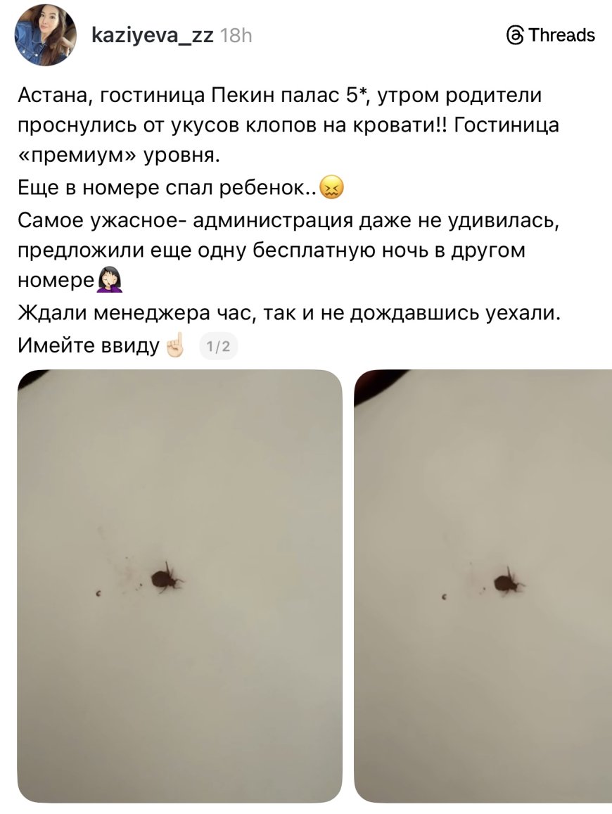 Threads қолданушысы kaziyeva_zz желіні шулатты. Оның айтуынша, ата-анасы таңертең денелерінің қышығанынан оянған. Көрпе-жастықты ақтарғанда, «премиум» қонақ үйдің нағыз иелері — қандалалар шыға келген. Ең сорақысы, қасында кішкентай бала да ұйықтаған.