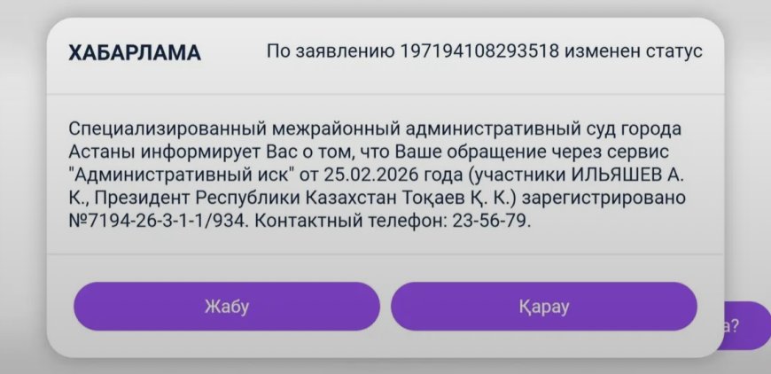 Сот белсендінің әкімшілік талап арызын тіркеді. Ильяшев соттан 2026 жылғы 11 ақпандағы №1170 жарлықты толығымен заңсыз деп тануды сұрап отыр.