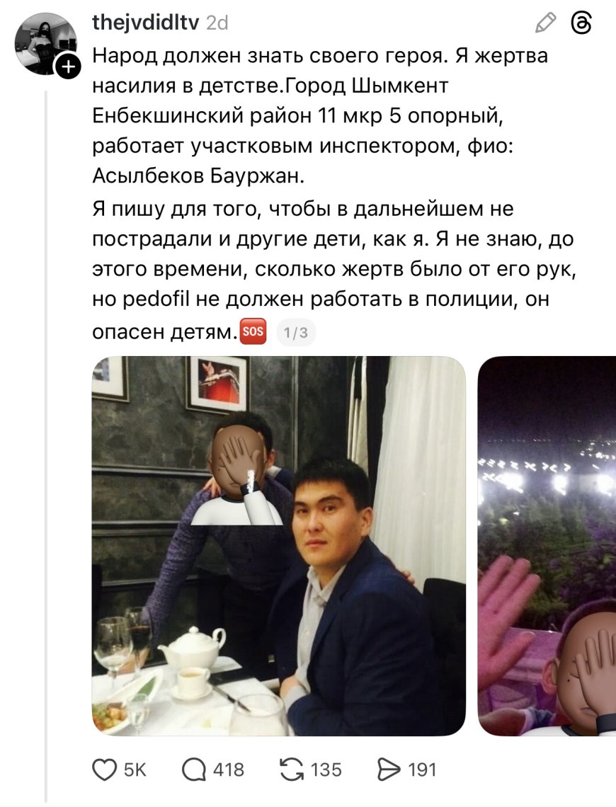 Threads әлеуметтік желісінде Шымкент қаласының тұрғыны бала күнінде зорлық-зомбылық көргенін айтып, белгілі бір полиция қызметкерін ашық айыптады, деп хабарлайды Sadaq.kz тілшісі.