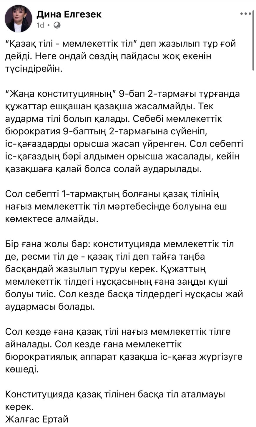«Мен, Дина Елгезек, Қазақстан азаматы ретінде Конституцияны талқылауға толық қақым бар. Тілімді қорғау — Отаным алдындағы перзенттік парызым!» — деп мәлімдеді.