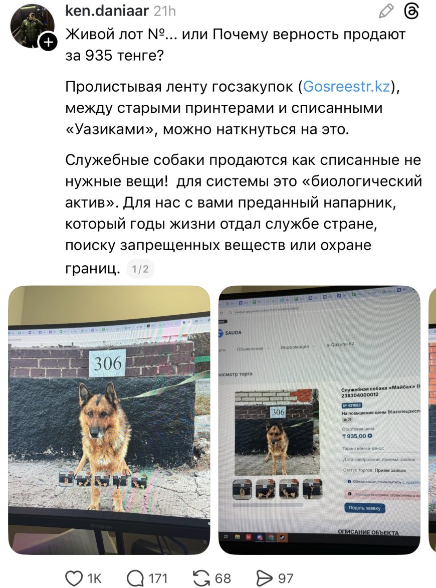 Threads әлеуметтік желісінде кен.daniaar есімді қолданушының жазбасы нағыз резонанс тудырды. Оның айтуынша, мемлекеттік тізілім сайтында ескі техникалар мен жарамсыз кеңсе тауарларының арасында тірі жан иелері – қызметтік иттер тұр. Жүйе үшін бұл жай ғана «есептен шығарылған мүлік» болса, халық үшін бұл – сатқындықпен тең дүние.