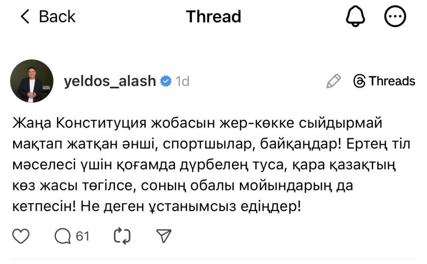 Бұл жағдайға белгілі Алаштанушы Елдос Тоқтарбай да үн қосып, заң жобасын жер-көкке сыйдырмай мақтаған жұлдыздарды қатаң сынады. «Ертең тіл мәселесі үшін қоғамда дүрбелең туса, қара қазақтың көз жасы солардың обалында болады», — деп ол инфлюенсерлердің ұстанымсыздығын айыптады.